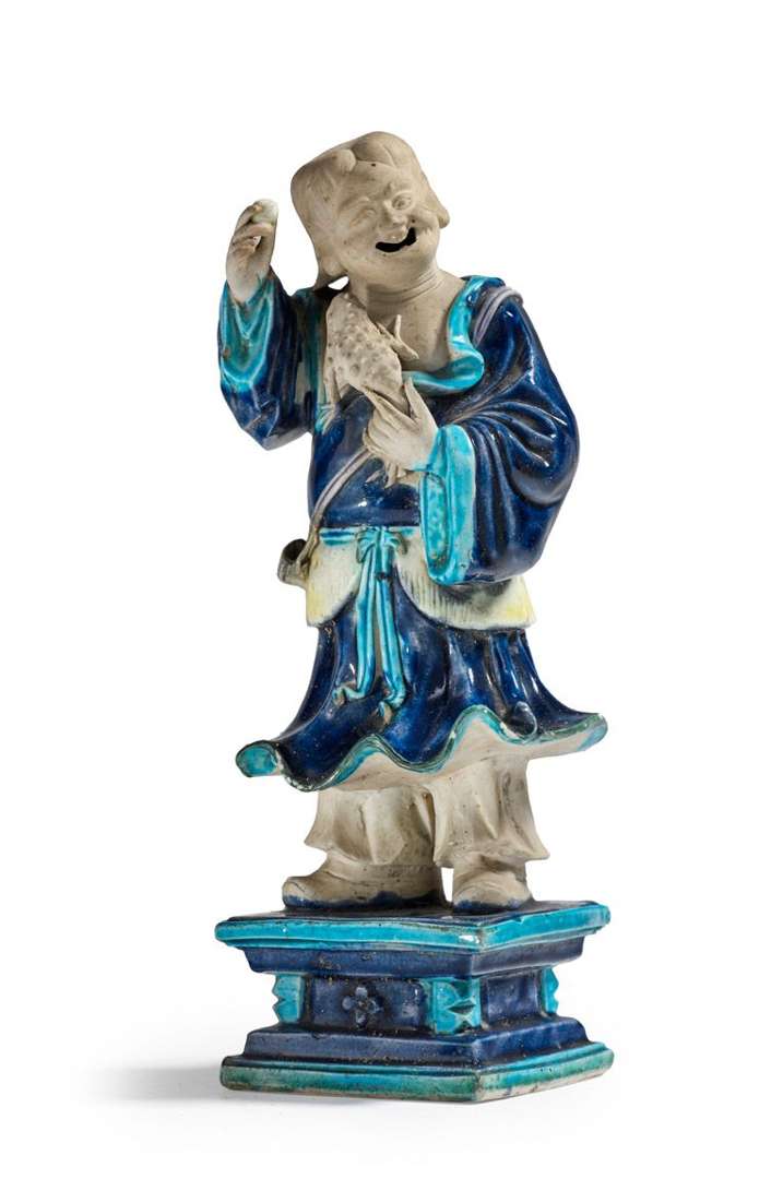 Statuette en biscuit émaillé en camaïeu de bleu et jaune, représentant Liu Hai debout sur une terrasse, tenant la perle sacrée et le crapaud dans ses bras.