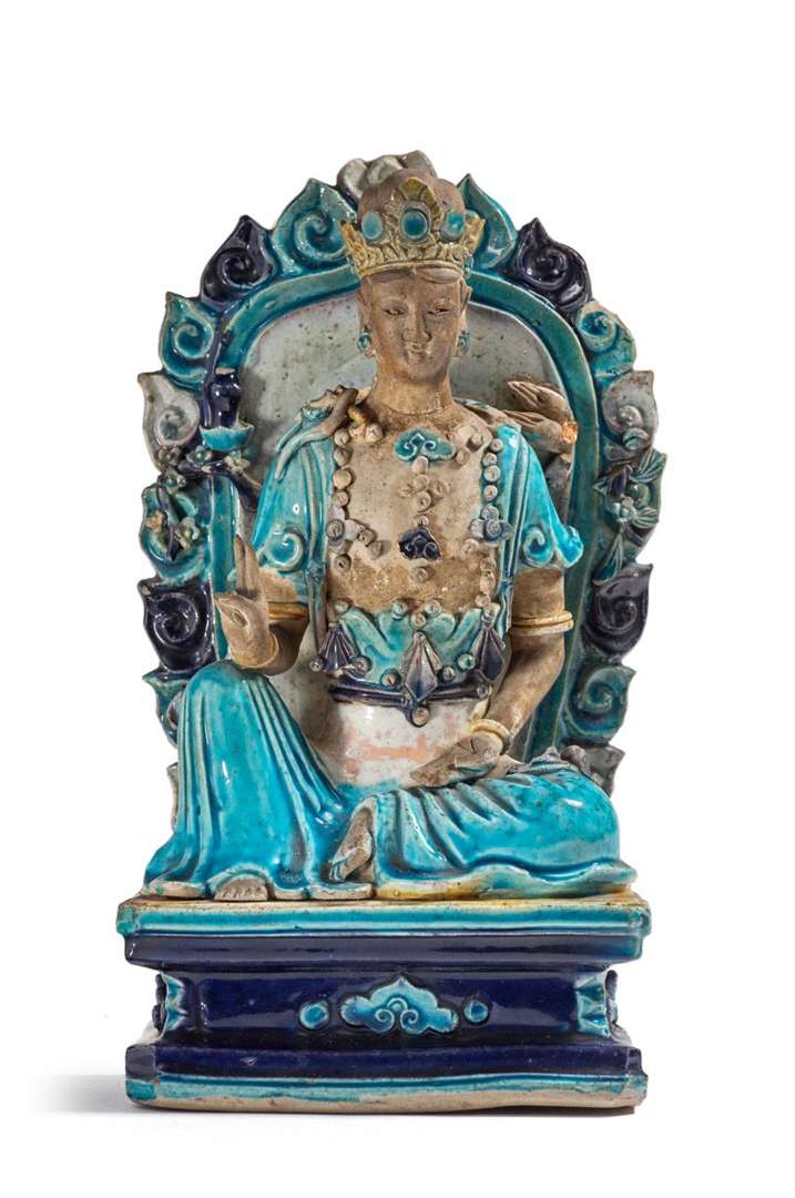 Groupe en biscuit émaillé bleu nuit turquoise et manganèse, représentant Guanyin assise en lalitasana. La mandorle en forme de pétale de lotus ornée d'une bordure feuillagée.