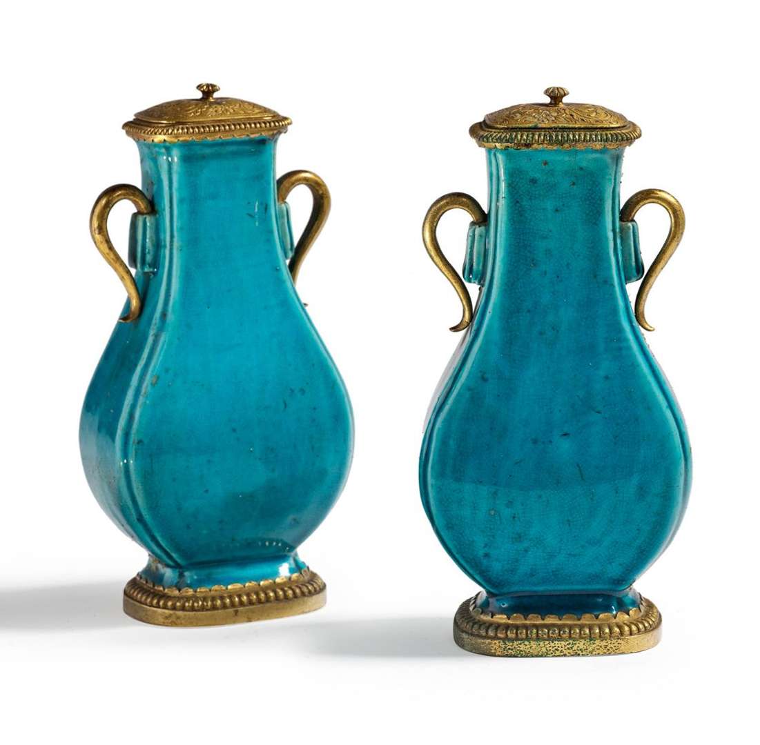 Paire de vases piriformes en biscuit émaillé avec anses annelées. La base, le couvercle et les anses rapportés, en bronze doré. Monture européenne.