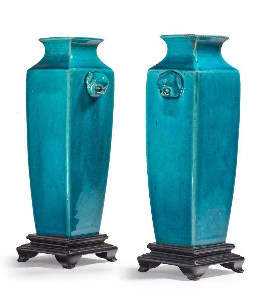 Paire de vases balustres quadrangulaires en biscuit émaillé bleu turquoise, les anses formant des têtes de lion.