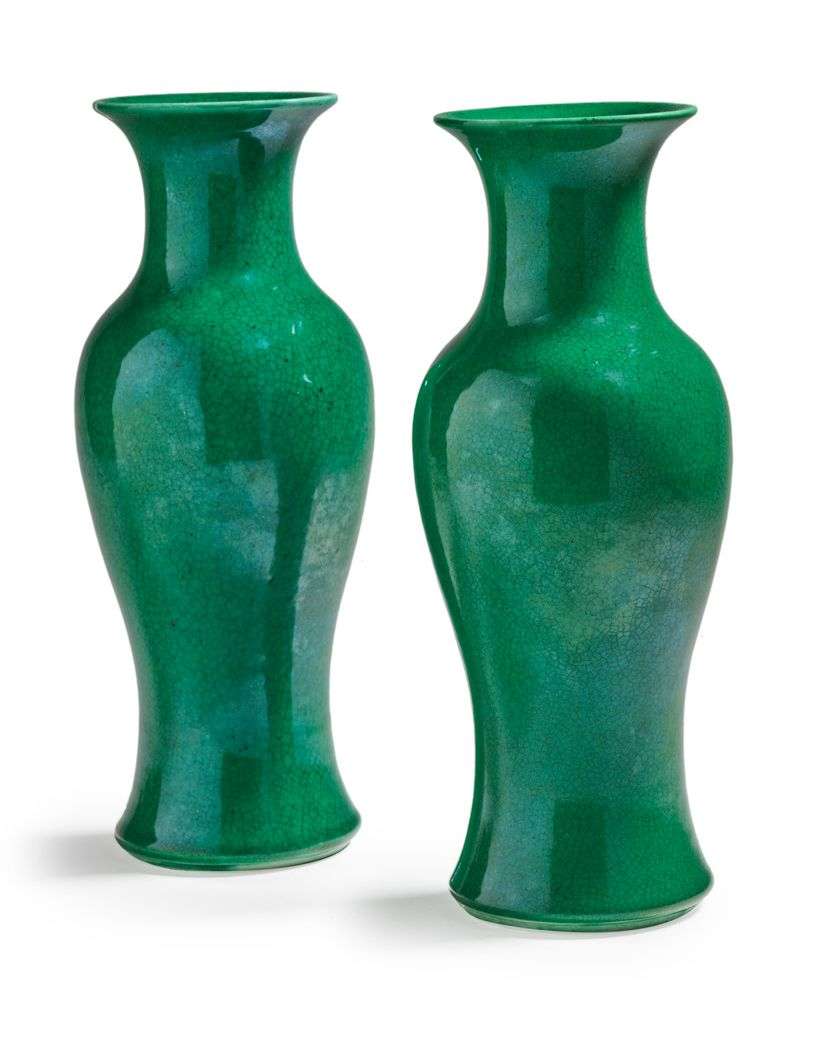 Paire de petits vases balustres en porcelaine émaillée vert pomme craquelé.