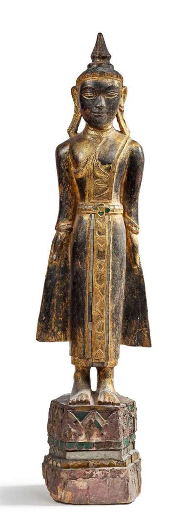 Importante statue en bois anciennement laqué et doré représentant le Bouddha debout sur un socle lotiforme, les deux mains longeant son corps revêtu de la robe monastique (du kesa), le visage paisible esquissant un léger sourire, surmonté de la flamme ushnisha stylisée, les longs lobes d'oreilles symbolisant l'écoute du monde. Incrustations de verroterie (?) sur la ceinture et le socle.