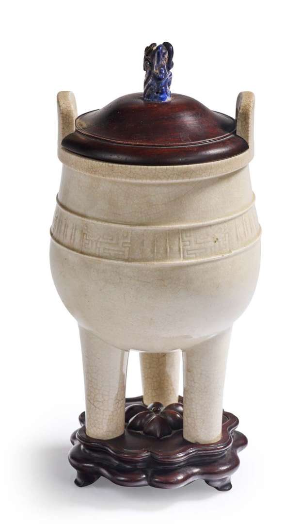 Vase tripode Ding en porcelaine émaillée craquelé crème, orné d'un bandeau à décor incisé de dragons Gui, l'ouverture soulignée de deux anses ajourées. Avec couvercle en bois et prise en lapis-lazuli en forme de cinq lingzhi entremêlés.
