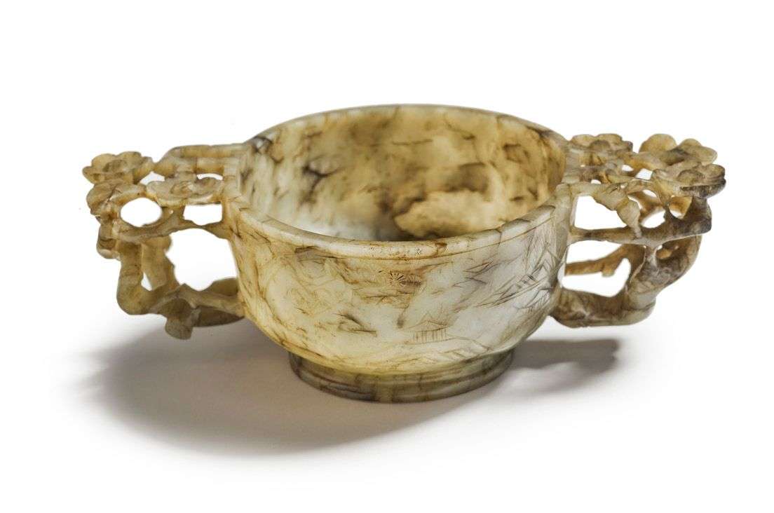 Coupe libatoire en jade beige partiellement infusé de brun, ornée de deux anses en forme de branches de prunus en fleurs. Le pourtour finement sculpté en léger relief d'un lettré sous un pin de longévité, aux abords d'un ermitage. Pics montagneux et saule-pleureurs complètent le décor.