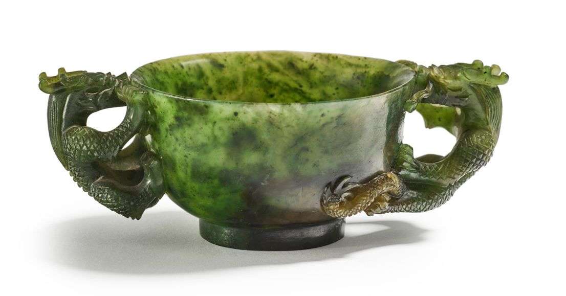 Coupe libatoire en jade vert épinard, orné de deux anses en forme de dragons.