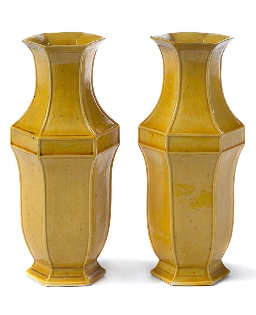 Paire de vases hexagonaux en porcelaine émaillée jaune, l'épaule et la longueur des vases rehaussées de légères lignes en relief.