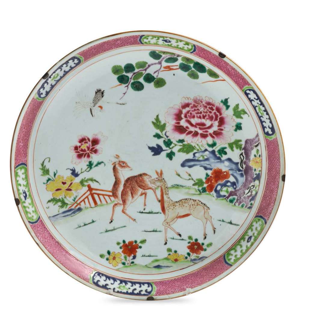Grande coupe en porcelaine et émaux de la famille rose à décor d'un couple de daims auprès d'une terrasse survolée par une grue sous une branche de pin, parmi un chrysanthème épanoui sur un rocher avec pivoines, la bordure ornée sur le pourtour de six cartouches alternés sur un fond rose à décor géométrique.