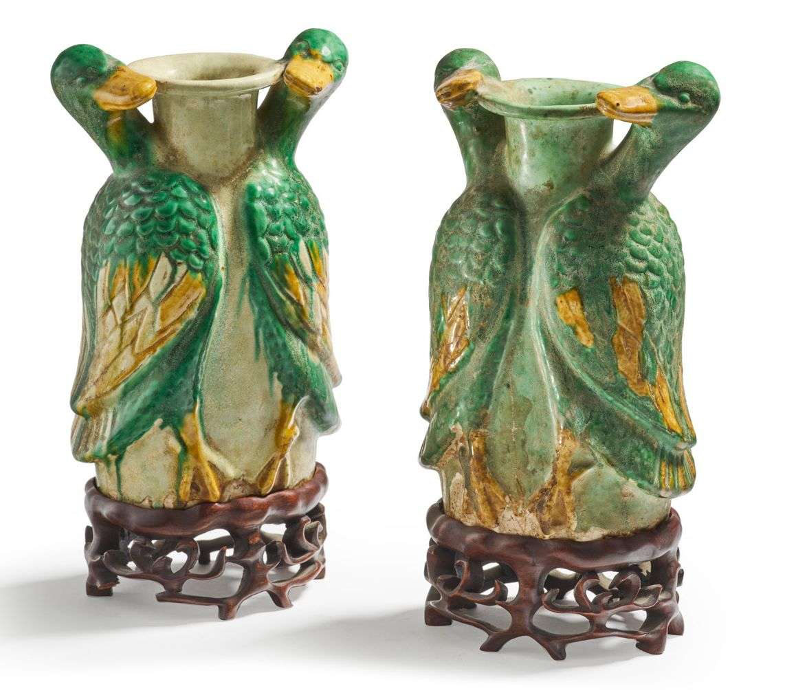 Deux vases en biscuit émaillé sancai à décor en relief d'un couple de canards entourant dans leur longueur jusqu'au col chaque vase avec une glaçure vert pâle finement craquelée.