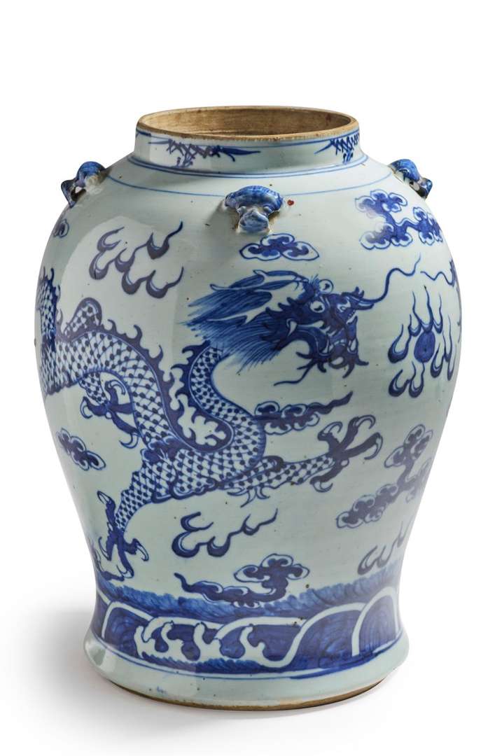 Potiche en porcelaine blanche à décor en bleu sous couverte de deux dragons s'affrontant autour de la perle sacrée parmi des nuages stylisés au-dessus de flots écumants, l'épaule rehaussée de quatre têtes zoomorphes.