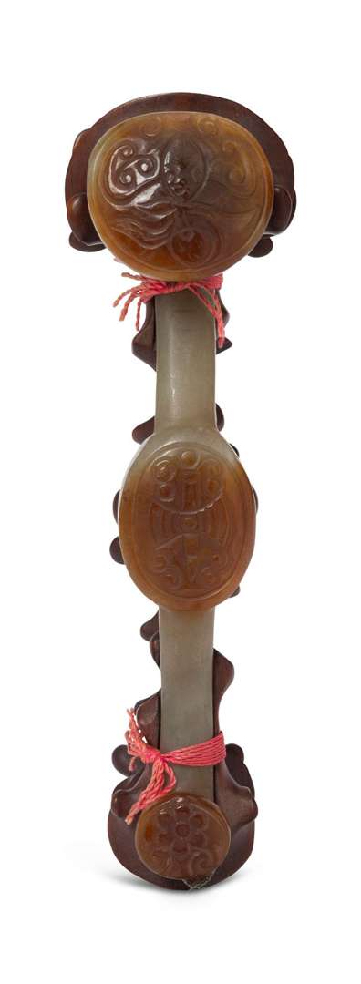Sceptre ruyi en jade céladon infusé de rouille à décor de fleurs sur les têtes de ruyi et motifs géométriques. Sur son socle en bois sculpté.