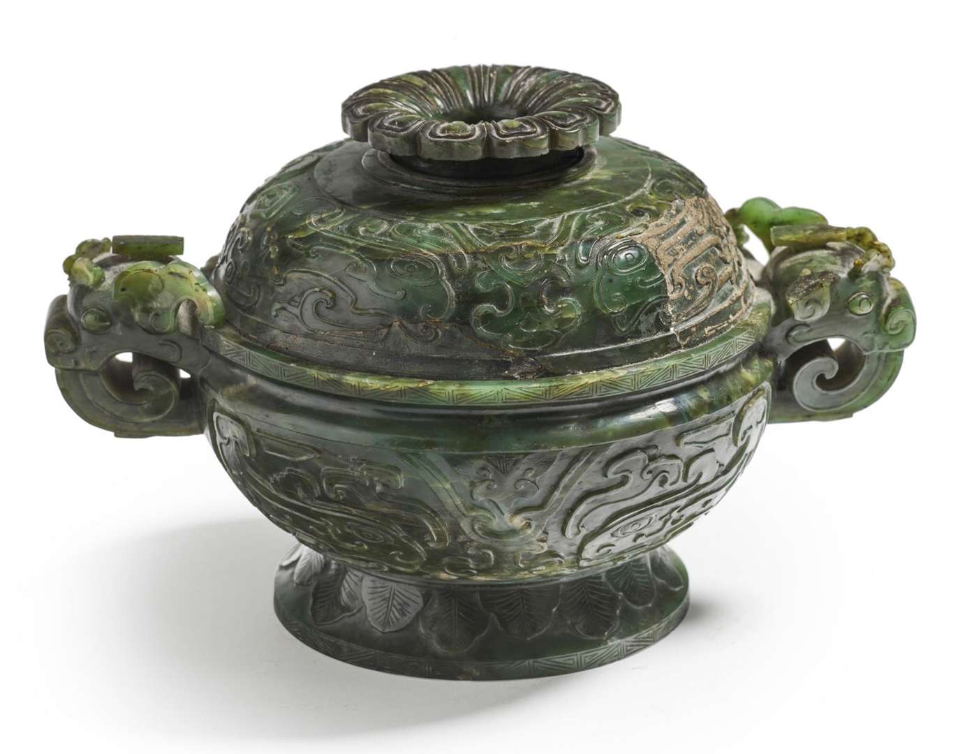 Vase couvert en jade épinard à décor de motifs archaïsants, masques de taotie, frise de feuilles de bananiers sur le piédouche, frise de motifs géométriques sur le pourtour du couvercle et la base. Prise du couvercle composée de pétales de lotus