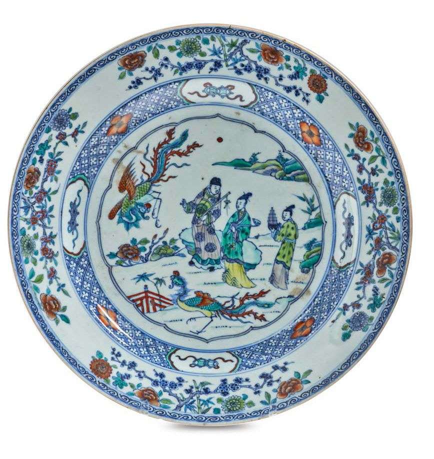 Grande coupe en porcelaine et émaux doucai à décor d'un dignitaire tenant une flûte, accompagné d'une musicienne et d'une jeune femme tenant un sceptre, entourés de deux phénix dans un jardin, les frises à décor de pivoines, chrysanthèmes, prunus et bambous.