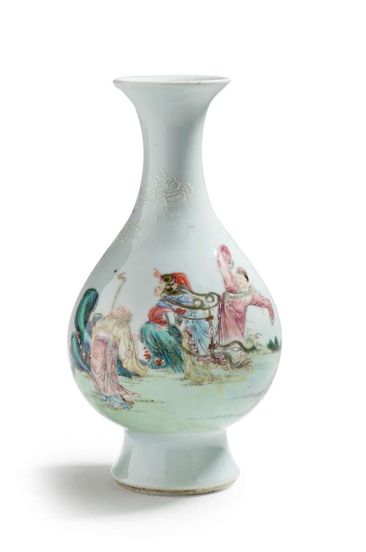 Petit vase balustre en porcelaine et émaux de la famille rose, à décor de trois dignitaires auprès d'un pin dans un jardin, s'adressant à un homme dans les nuages.