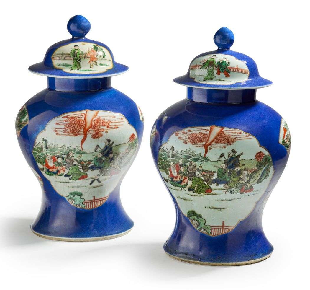 Paire de potiches couvertes en porcelaine, à décor en médaillons de la famille verte des huit immortels observant une nuée s'échappant d'une coloquinte, sages dans la forêt de bambous, scènes paysagées, reposant sur un fond bleu nuit. La prise du couvercle en forme de bouton de lotus. Marque au double-cercle sur la base.