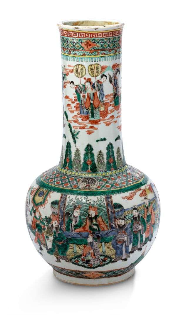 Paire de vases pansus à long col en porcelaine émaillée de la famille verte, à décor de scènes de parades animées de personnages et de frises de bananiers à la base du col.