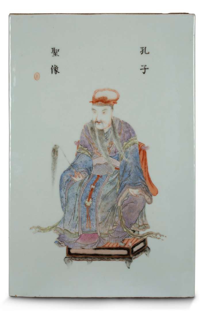 Plaque rectangulaire en porcelaine et émaux de la famille rose, représentant le portrait de kongZi (confucius) assis sur un trône et tenant un chasse-mouches.