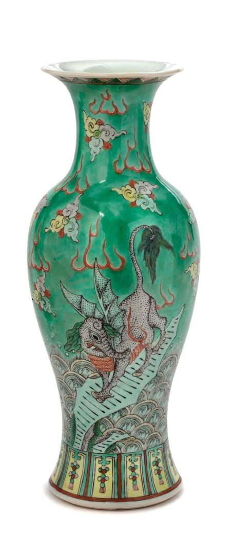 Vase en porcelaine et émaux de la famille verte à décor de trois animaux fantastiques émergeants de pics montagneux parmi les nuages stylisés.