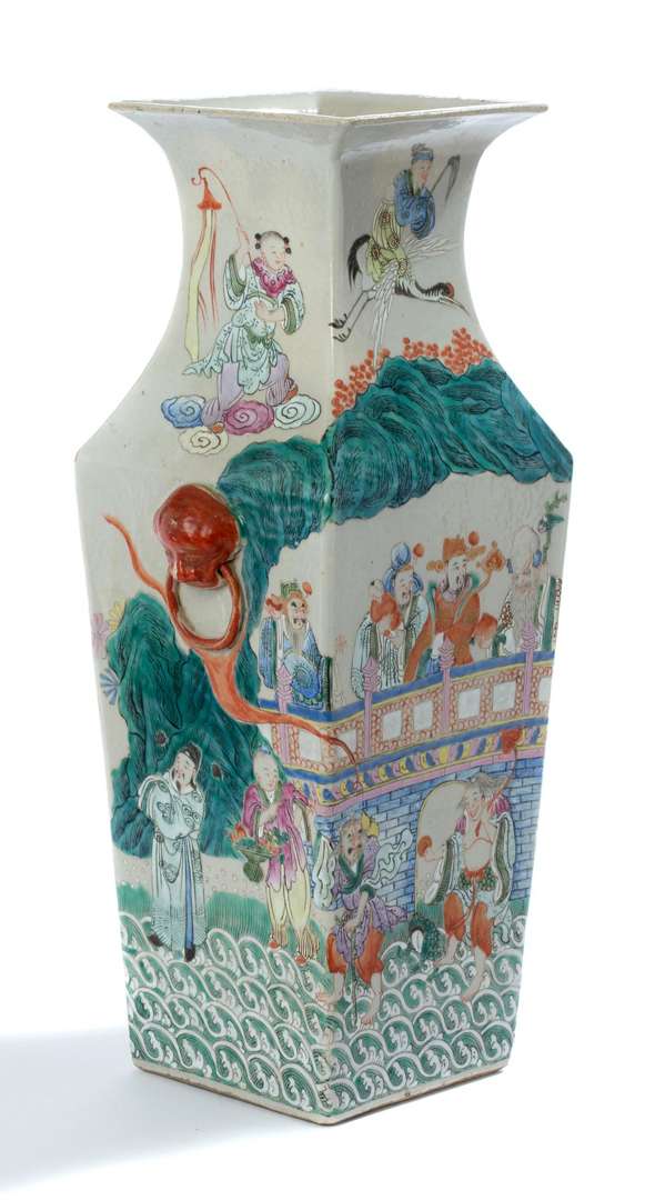 Vase balustre quadrangulaire en porcelaine et émaux de la famille rose, à décor d'une scène en continu sur la panse, figurant plusieurs immortels taoïstes, dont les Sanxing sur un pont surplombant des flots où évoluent d'autres immortels, deux têtes de félin en relief corail rehaussant l'épaule.