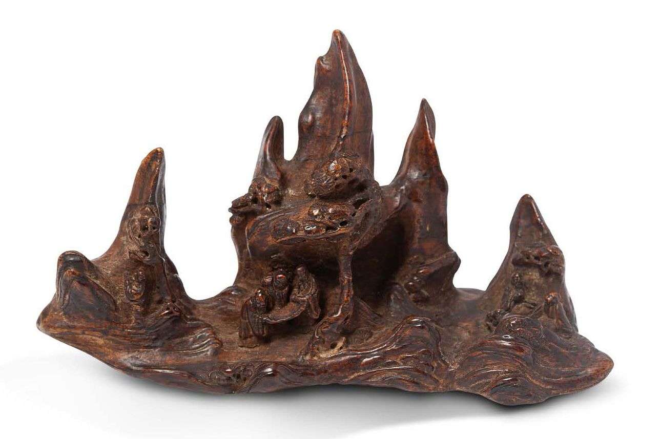 Repose-pinceaux en bois de chenxiang, reprenant la forme de pics montagneux, sur lesquels se trouvent des lettrés sous des pins de longévité.