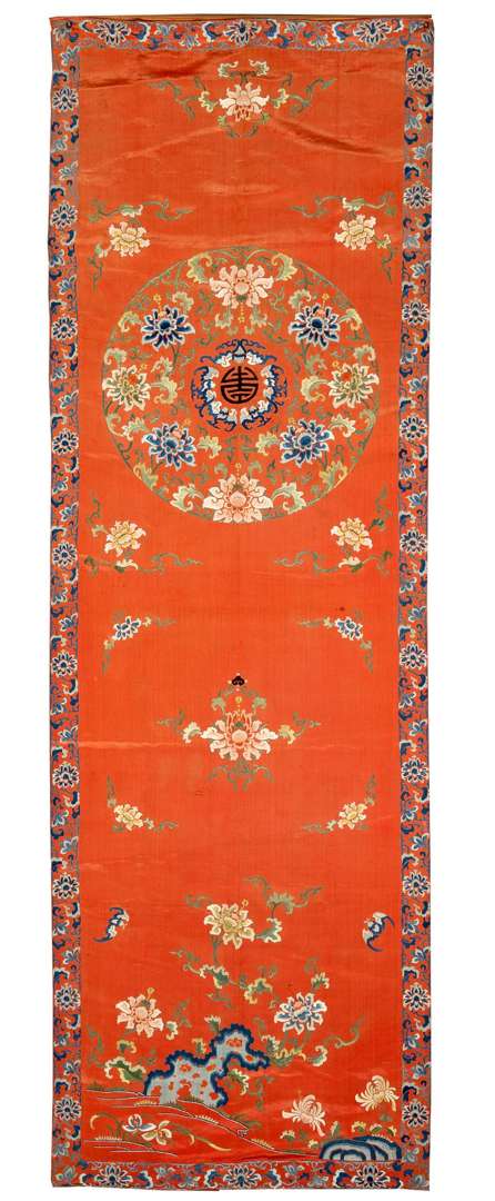 Panneau en soie et lin, brodé de fils polychromes, à décor sur fond corail d'un médaillon central de fleurs de lotus entourant les wufu autour d'un caractère shou brodé en noir, des compositions florales et frises en camaïeu de bleu complètent l'ornementation.