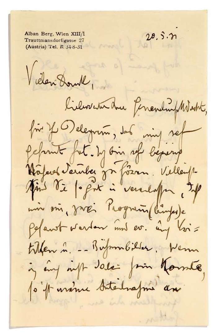 L.A.S. «Alban Berg», Wien 20 mai 1931, [à l'intendant général de l'opéra de Fribourg-en-Brisgau] | 2 pages in-8 à son adresse | en allemand.