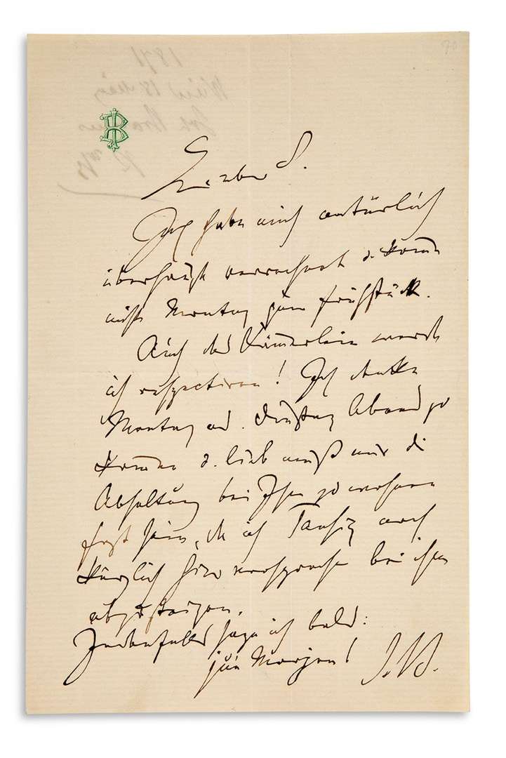 Il a mal calculé et ne viendra pas lundi pour le petit déjeuner. Et il respectera la petite chambre ! Il pense venir lundi ou mardi soir, mais il a récemment promis à Tausig [le pianiste Carl TAUSIG (1841-1871)] qu'il resterait avec lui...