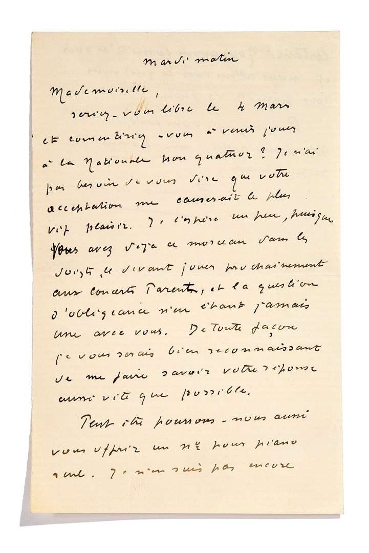 Nationale mon quatuor ? [...] vous avez déjà ce morceau dans les doigts, le devant jouer prochainement aux Concerts Parent [...] Peut-être pourrons-nous aussi vous off rir un n° pour piano seul. Je ne suis pas encore certain. Nous avons comité ce soir et nous allons voir ce qui nous sera possible de faire»...