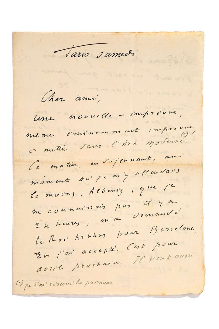 «Ce matin, en déjeunant, au moment où je m'y attendais le moins, ALBENIZ, que je ne connaissais pas il y a 24 heures, m'a demandé le Roi Arthus pour Barcelone. Et j'ai accepté. C'est pour avril prochain. Il veut aussi le drame de d'INDY [Fervaal], mais Vincent ne sait que faire à cause de Stoumon [directeur de la Monnaie de Bruxelles, qui devait monter les deux opéras]. Il temporise. Donc je vais débuter en catalan (pas en espagnol) loin de mes amis bruxellois. Je les regrette sincèrement beaucoup. Mais j'espère que cela ne m'empêchera pas de réapparaître à la Monnaie. Je serai encore théâtralement demi-vierge. Et c'est très à la mode maintenant [allusion au roman Les Demi-Vierges de Marcel Prévost]»...
