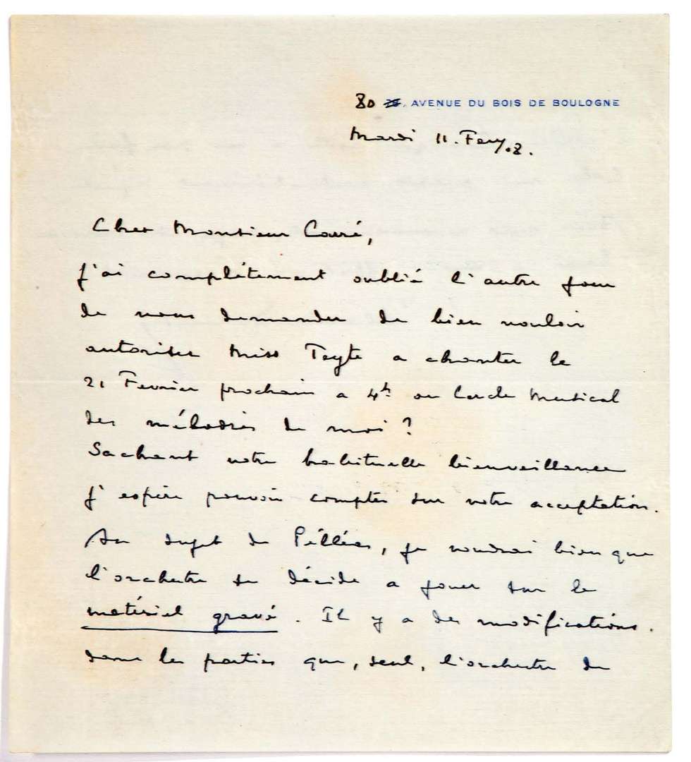 Il a oublié de lui demander de bien vouloir autoriser Maggie TEYTE à chanter le 21 février «au Cercle Musical des mélodies de moi», et compte sur sa bienveillante acceptation. «Au sujet de Pélléas, je voudrais bien que l'orchestre se décide à jouer sur le matériel gravé. Il y a des modifi - cations, dans les parties que, seul, l'orchestre de l'Opéra Comique reste à ne pas faire. Cela me paraît particulièrement injuste !»...