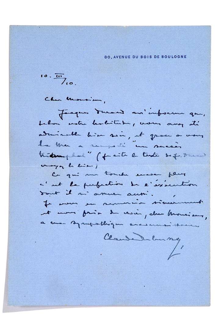 «Jacques Durand m'informe que, selon votre habitude, vous avez été admirable hier soir, et grâce à vous la Mer a remporté “un succès triomphal” (je cite le texte de J. Durand, croyez-le bien). Ce qui me touche encore plus c'est la perfection de l'exécution dont il m'assure aussi». Il l'en remercie... Correspondance, n° 1910-30.