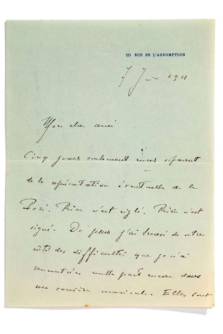 L.A.S., 7 juin 1911, à Serge de DIAGHILEW à l'Hôtel Brighton | 3 pages in-12 à son adresse, enveloppe.