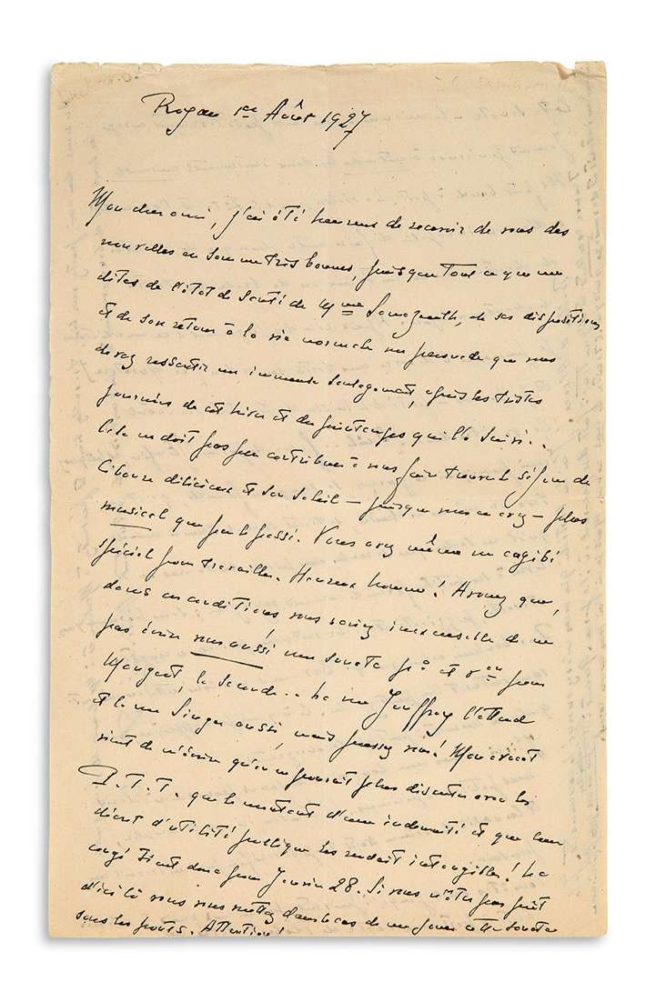 L.A.S. (monogramme), Royan 1er août 1927, [à Gustave SAMAZEUILH] | 2 pages in-8 très remplies d'une petite écriture.
