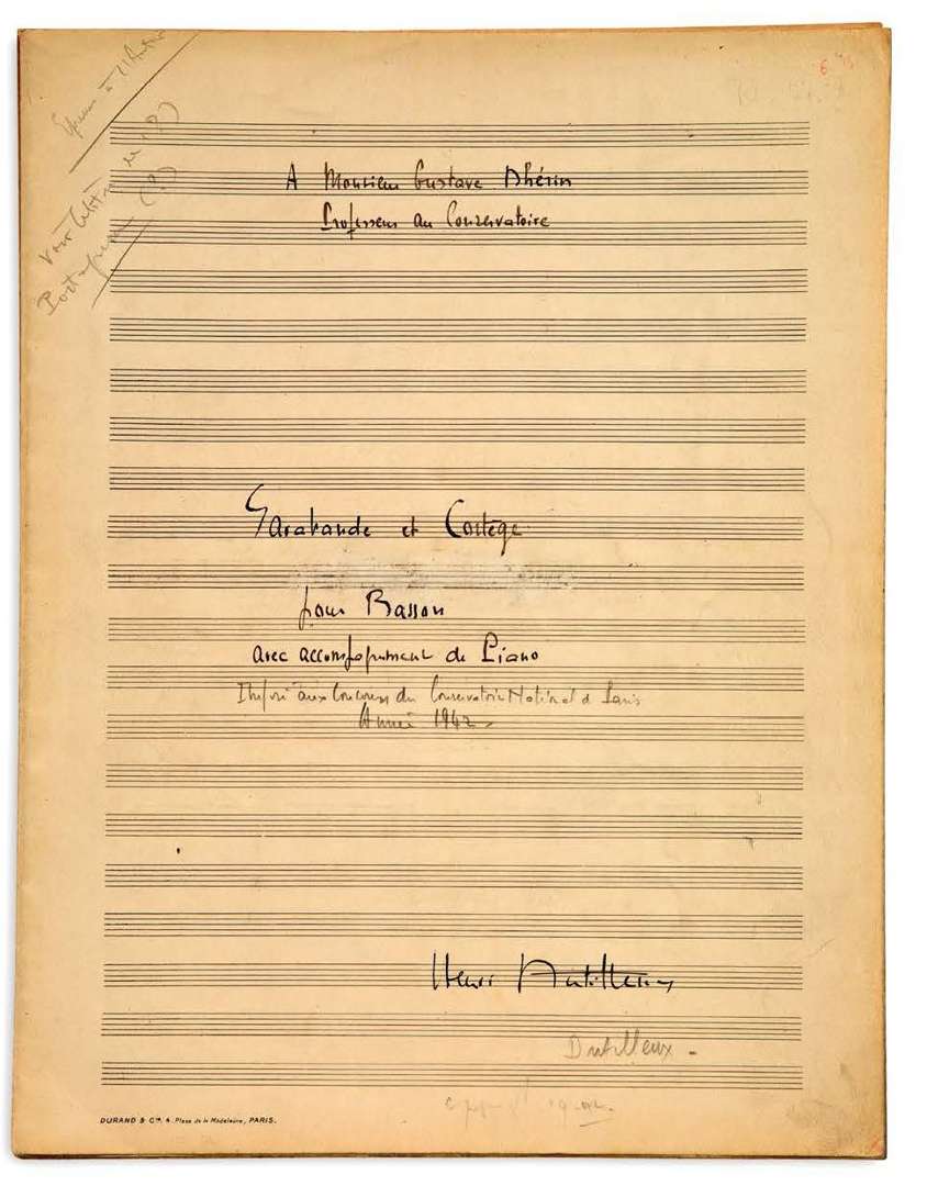 MANUSCRIT MUSICAL autographe signé «Henri Dutilleux», Sarabande et Cortège pour basson avec accompagnement de piano (1942) | titre et 12 pages in-fol. (cachets encre de l'éditeur).