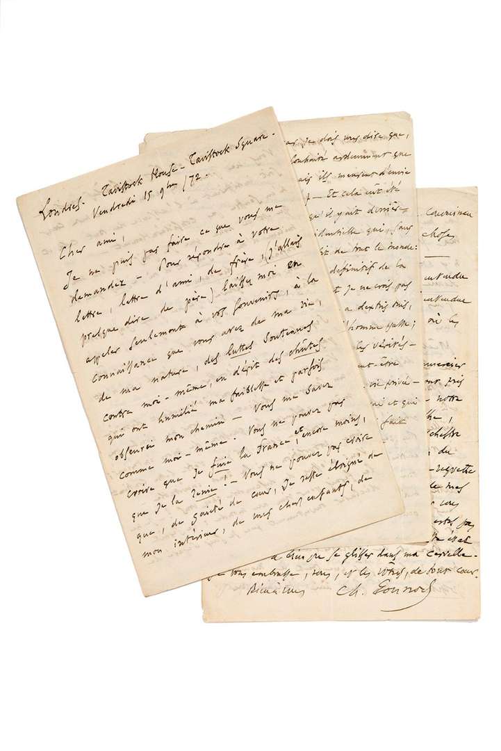 Longues lettres intimes sur son exil à Londres et sa situation familiale, et leur collaboration pour Les Deux Reines. [Gounod a écrit la musique de scène pour la pièce de Legouvé, qui sera créée le 27 novembre 1872.] 15 novembre. Il fait appel aux souvenirs de son ami, «à la connaissance que vous avez de ma vie, de ma nature, des luttes soutenues contre moi-même, en dépit des chûtes qui ont humilié ma faiblesse et parfois obscurci mon chemin. [...] Vous ne pouvez pas croire que je fuie la France, et encore moins, que je la renie ! [...] Qu'est ce donc que je fuis ? C'est un milieu d'où je sens et d'où je sais que la confi ance a disparu. [...] je ne peux pas vivre sans cela : le foyer, à mes yeux, ne doit pas avoir une ombre sous ce rapport : être séparés par un nuage perpétuel, ce n'est pas vivre, c'est étouff er»... Il refuse l'hospitalité de Legouvé : «Je ne le ferais pour rien au monde : ce serait déclarer ouvertement que je suis séparé de ma femme, et faire à votre hospitalité si digne et si chère l'injure d'une sorte de complicité et de sanction. Or, je ne suis pas séparé de ma femme, et je ne veux point l'être. Je respecte ma femme, et je ne ferai ni au nom qu'elle a reçu de sa famille ni à celui qu'elle tient de moi le chagrin et le scandale d'échapper ainsi aux peines qui peuvent traverser ma vie et la rendre très douloureuse. Non : quand je rentrerai à
