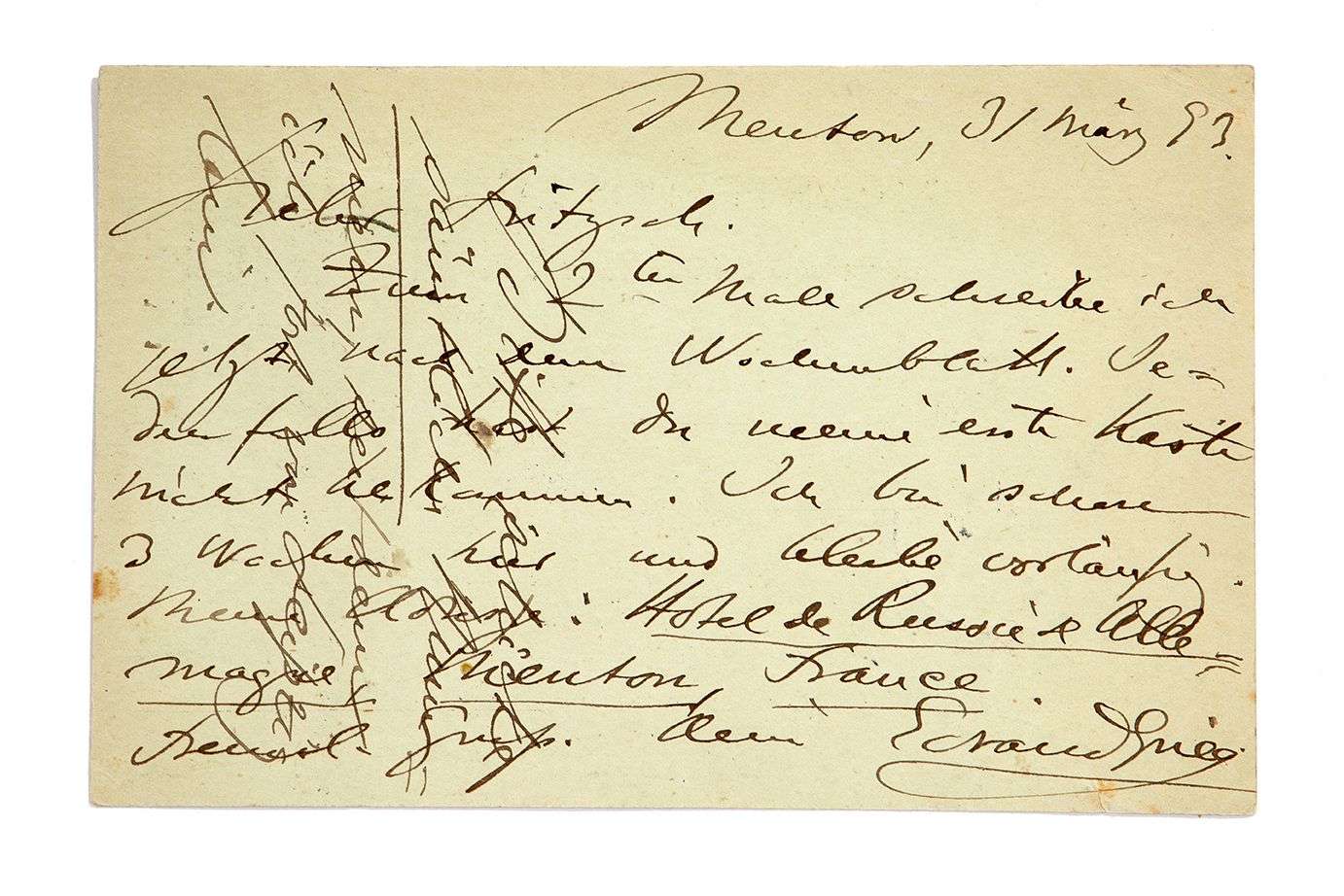 L.A.S. «Edvard Grieg», Menton 31 mars 1893, à E.W. Fritzsch à Leipzig | 1 page oblong in-12, adresse au dos (carte postale) | en allemand.