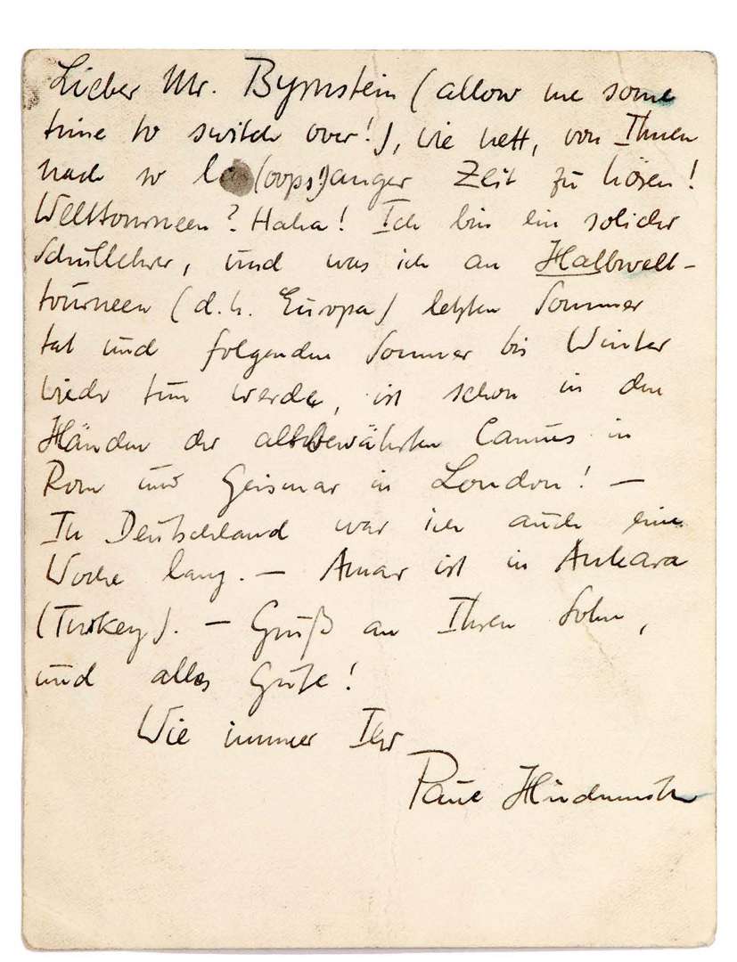 L.A.S. «Paul Hindemith», [New Haven (Connecticut) fi n 1947], à Arthur BERNSTEIN | 1 page in-12 au dos d'une carte illustrée | en allemand.