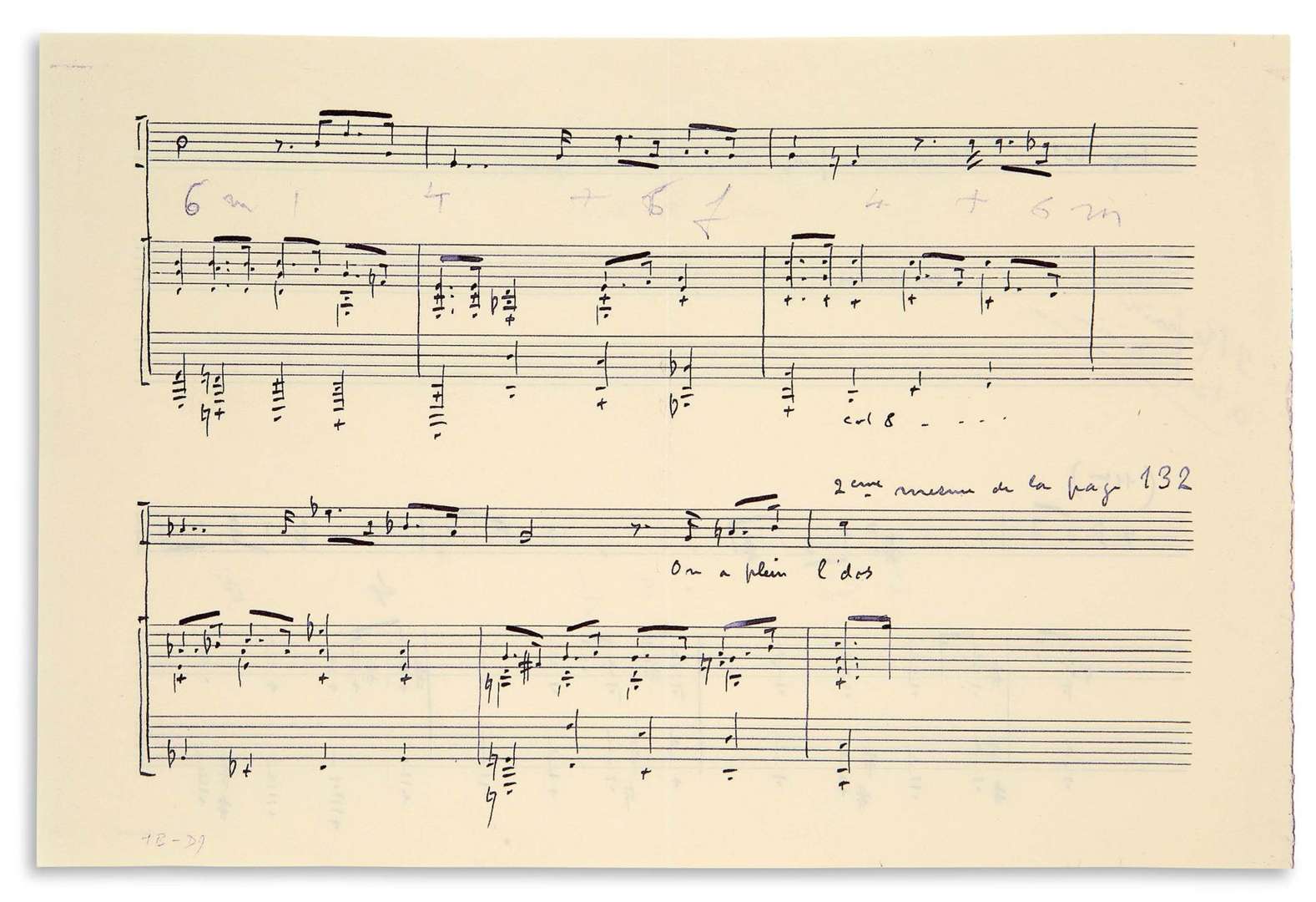 Il s'agit ici d'une addition de 10 mesures entre les pages 131 et 132 de la partition, pour voix avec accompagnement de piano. Elle est notée sur 3 systèmes de 3 portées, sans paroles, sauf pour les dernières notes : «On a plein l'dos».