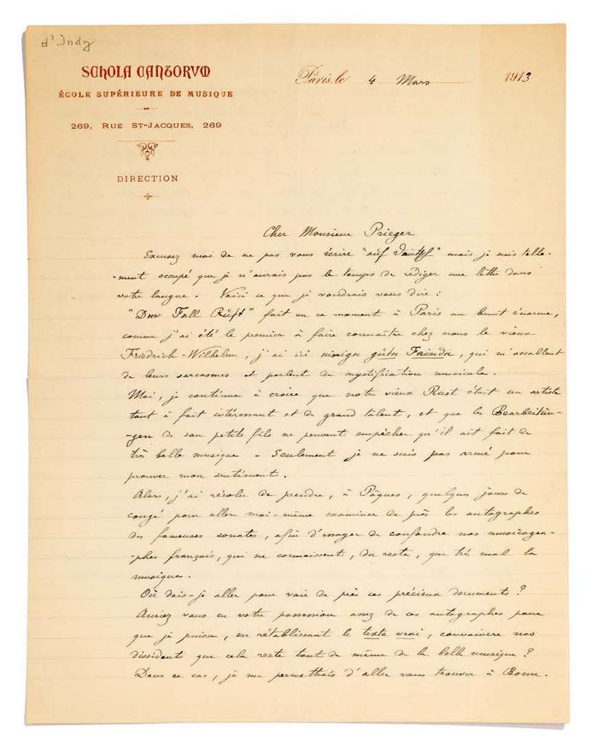 PRIEGER | 2 pages in-4 à en-tête de la Schola Cantorum.