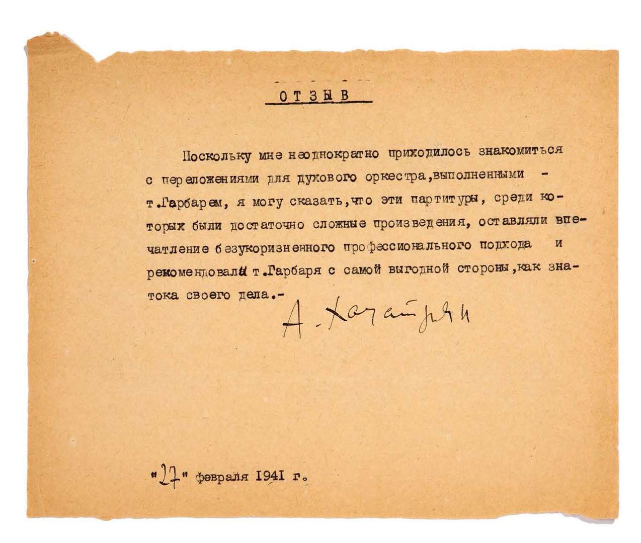 P.S. «A. Хачатурян», 27 février 1941 | 1 page oblong in-8 dactylographiée | en russe.
