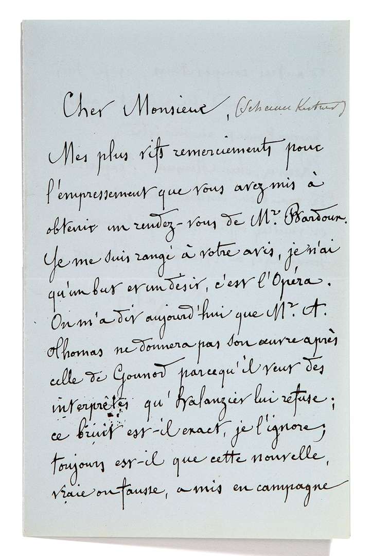 Il le remercie de lui avoir obtenu un rendez-vous avec Bardoux : «je n'ai qu'un but et un désir, c'est l'Opéra». Il a appris qu'Ambroise Thomas «ne donnera pas son œuvre [Françoise de Rimini] après celle de Gounod parce qu'il veut des interprètes qu'Halanzier lui refuse | [...] cette nouvelle, vraie ou fausse, a mis en campagne d'autres compositeurs, et je suis bien heureux d'être présenté aussi promptement au ministre»... [Le Roi d'Ys ne sera fi nalement pas donné à l'Opéra | il faudra attendre le 7 mai 1888 pour que l'œuvre soit jouée à l'Opéra-Comique.]