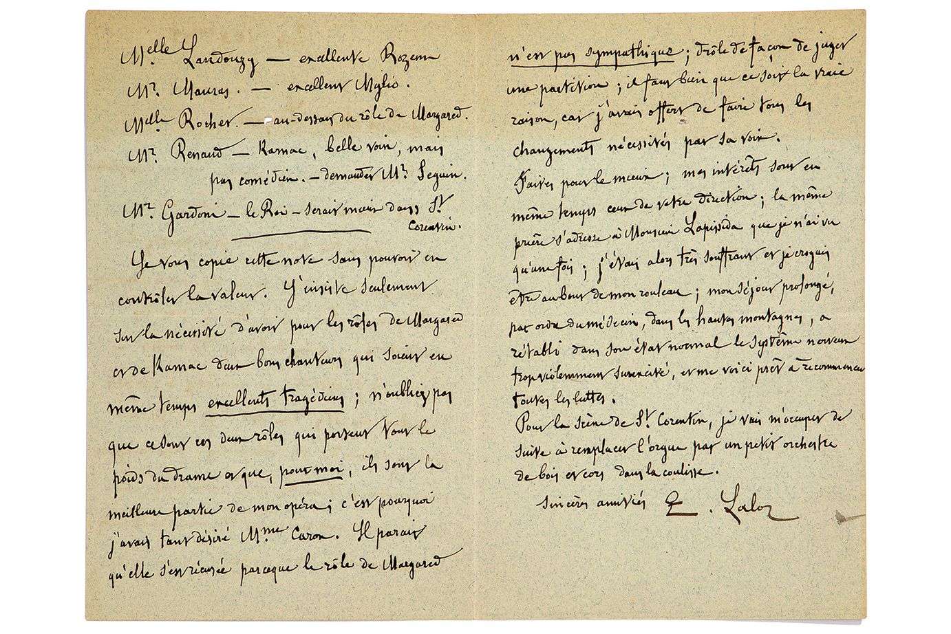 Il envoie à Dupont sa Symphonie, en espérant qu'il pourra la donner à un de ses Concerts populaires. Il pense que Mlle Landouzy et Mauras feront une «excellente Rozenn» et un «excellent Mylio», mais exprime des réserves sur d'autres chanteurs pour les rôles de Margared, Karnac et le Roi. Il insiste «sur la nécessité d'avoir pour les rôles de Margared et de Karnac deux bons chanteurs qui soient en même temps excellents tragédiens | n'oubliez pas que ce sont deux rôles qui portent tout le poids du drame et que, pour moi, ils sont la meilleure partie de mon opéra» | c'est pourquoi il désirait Rose Caron qui se serait «récusée parce que le rôle de Margared n'est pas sympathique | drôle de façon de juger une partition»... Il va s'occuper «à remplacer l'orgue par un petit orchestre de bois et cors dans la coulisse» pour la scène de St