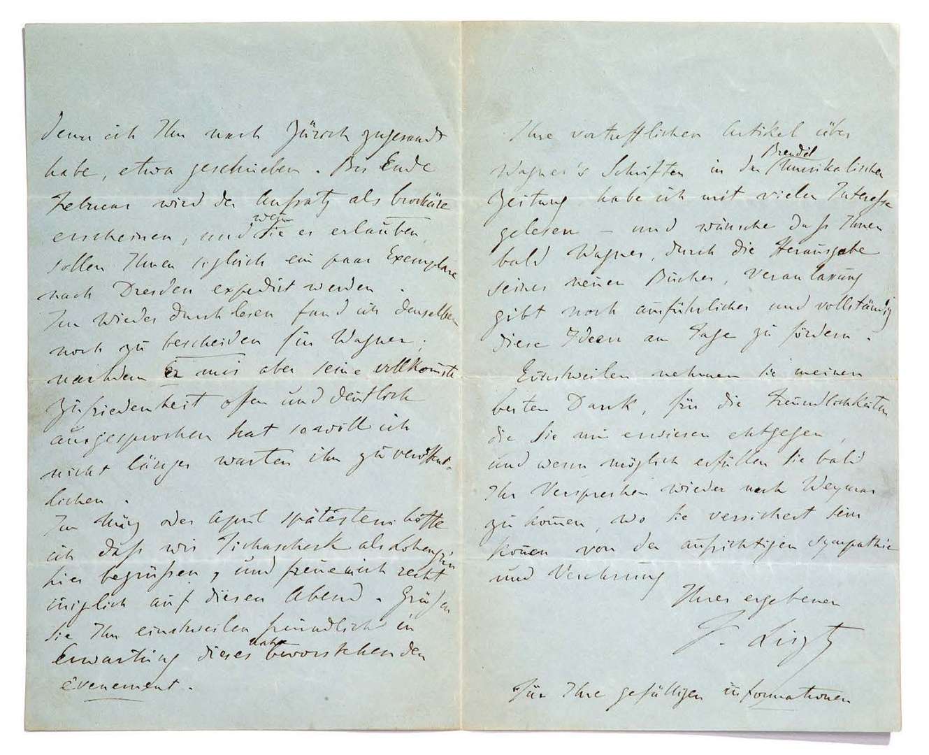L.A.S. «F. Liszt», [Weimar début 1851, à Theodor UHLIG] | 4 pages in-8 sur papier bleuté, en allemand.