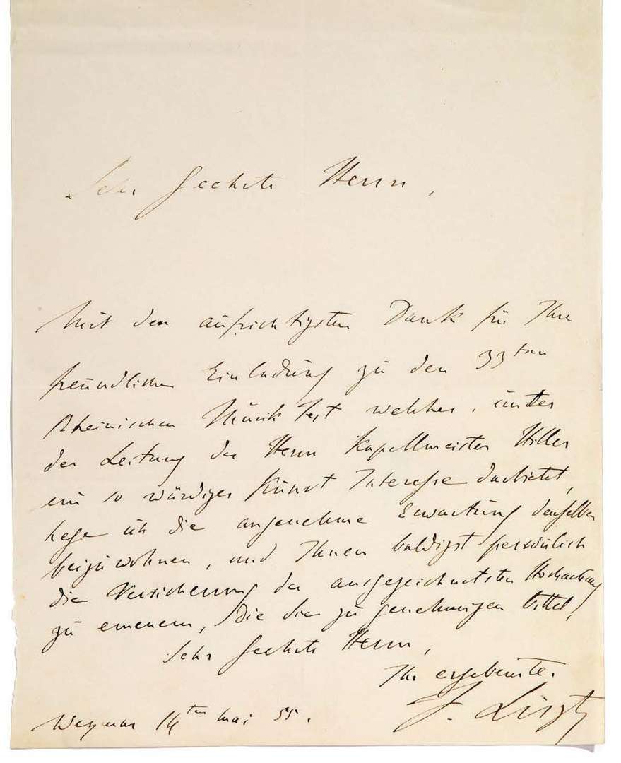 «Sehr geehrte Herrn, Mit den aufrichtigsten Dank für Ihre freundlichen Einladung zu den 33ten Rheinischen Musikfest welches, unter der Leitung des Herrn Kapellmeister Hiller ein so würdiger Kunst Interesse darbietet, hege ich die angenehme Erwartung denselben beizu wohnen, und Ihnen baldigst persönnlich die Versicherung der ausgezeichnetsten Hochachtung zu erneuern»...