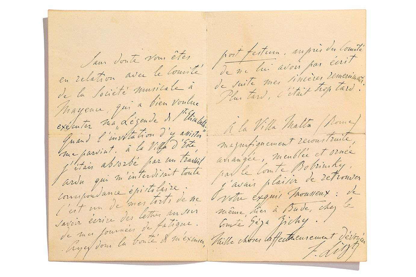 Il remercie du cadeau «mousseux et réconfortant», et espère remercier son correspondant viva voce à Budapest ou à Weimar, où il séjournera «de la mi-avril jusqu'à la fi n juillet». Il présente ses excuses au «Comité de la Société musicale de Mayence qui a bien voulu exécuter ma Légende de Ste Elisabeth. Quand l'invitation d'y assister me parvint, à la Villa d'Este, j'étais absorbé par un travail ardu qui m'interdisait toute correspondance épistolaire. [...] À la Villa Malta (Rome) magnifi quement reconstruite, arrangée, meublée et ornée par le Comte Bobrinsky, j'avais plaisir de retrouver votre exquis mousseux : de même, hier à Bude, chez le comte Géza Zichy