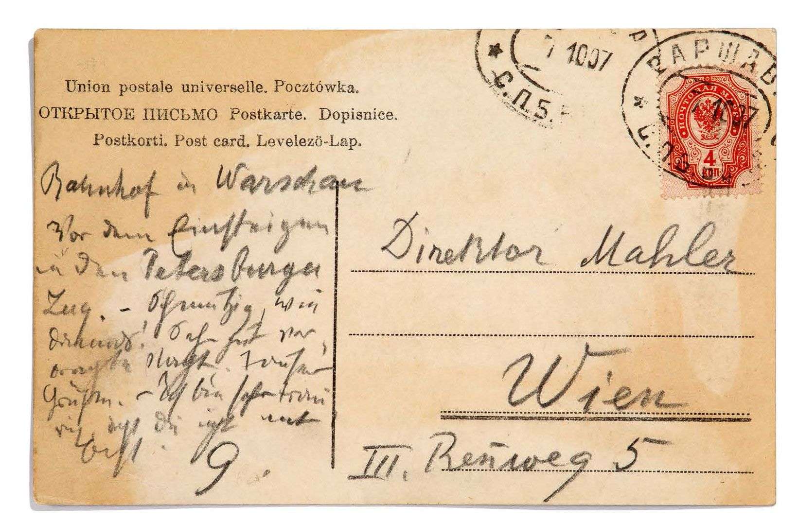 MAHLER | au crayon noir, au dos d'une carte postale illustrée en couleurs (Sobor na Saskim placu), adresse «Direktor Mahler