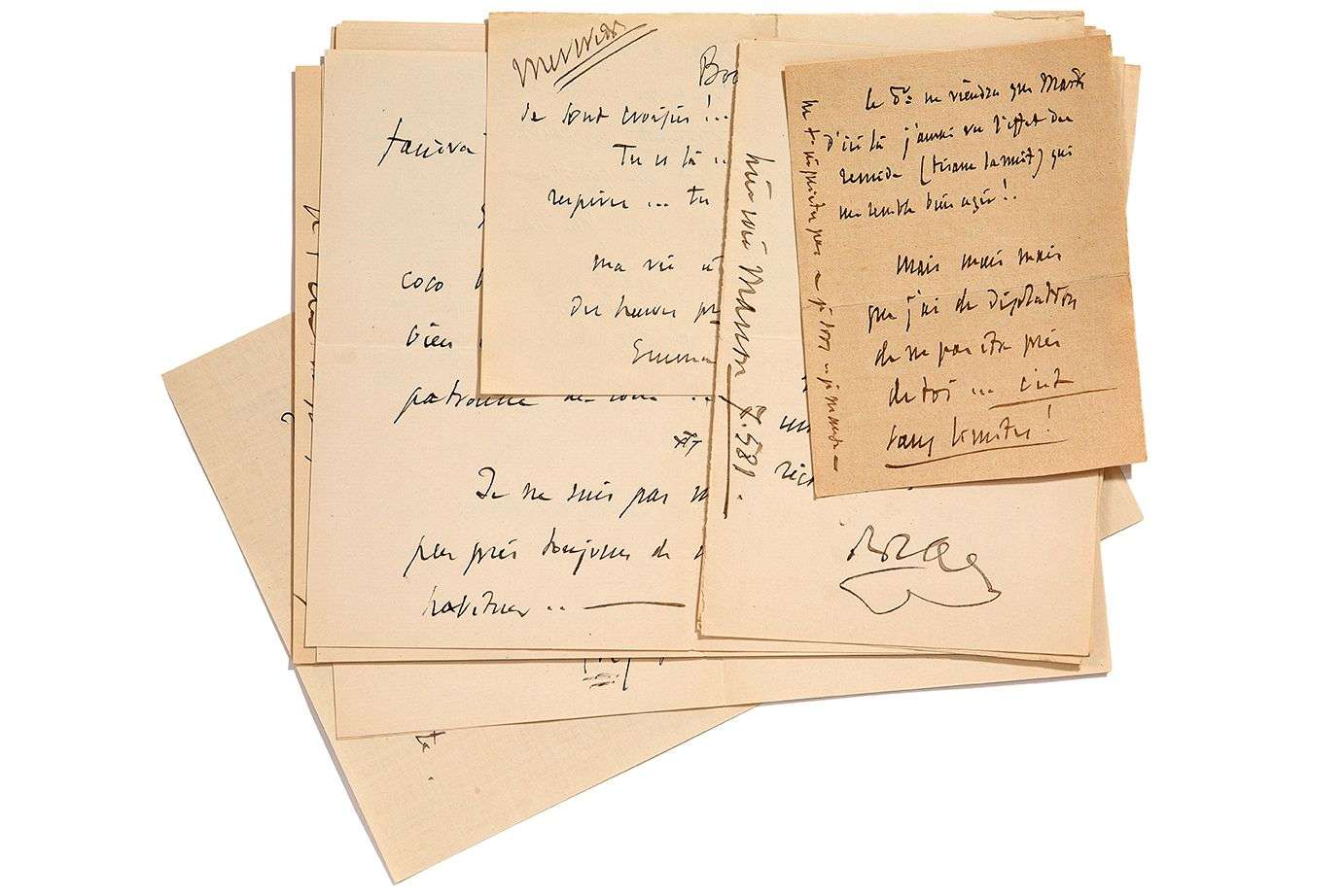 En 1905-1907, il dit souvent son ennui : «Je m'ennuie... je m'ennuie... et je vais continuer à m'ennuyer... [...] Hier soir Manon 7.581» | mais aussi sa tendresse : «Je pense à toi et c'est ma vie»... Avec Heugel, il négocie à l'Opéra... «Messager a dit à Heugel qu'il remettrait Thaïs EN ENTIER à la scène décors &c... pour Mlle Mary Garden»... Il parle des répétitions d'Ariane à l'Opéra.... Etc.