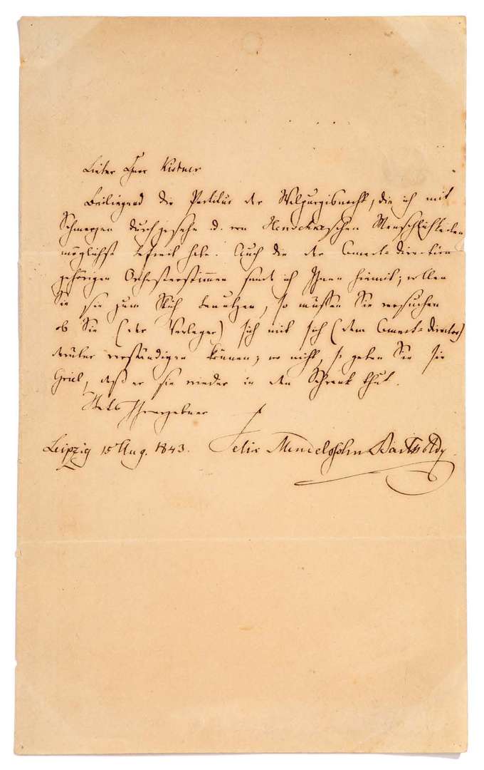 L.A.S. «Felix Mendelssohn Bartholdy», Leipzig 15 août 1843, à l'éditeur Friedrich KISTNER | demi-page in-8, adresse avec petit cachet de cire noire | en allemand.