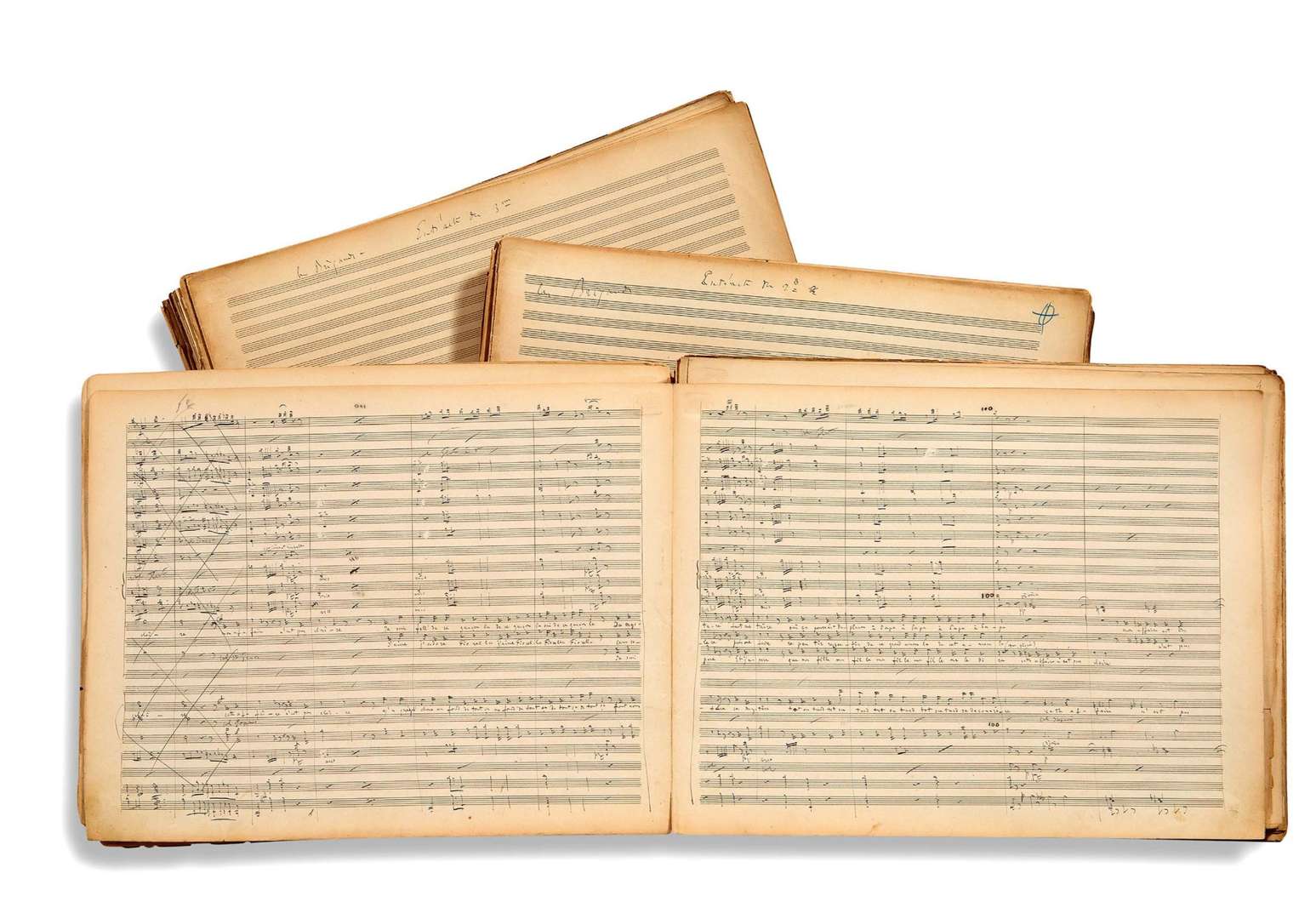 Important manuscrit de travail de la partition d'orchestre de l'opéra-bouff e Les Brigands, présentant d'importantes variantes avec la partition publiée et des passages inédits.
