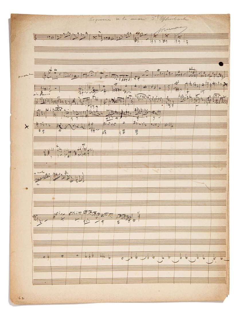 Esquisses musicales sur les deux pages d'un feuillet à 20 lignes d'un fragment de partition d'orchestre (paginée 23-24) sur laquelle ne figure qu'une voix instrumentale (24 mesures) | sur le feuillet retourné, Offenbach a noté plusieurs thèmes et esquisses, notamment pour une «Ouverture» et un «air Rococo». La page est certifiée en haut au crayon par Pierre Cornuau