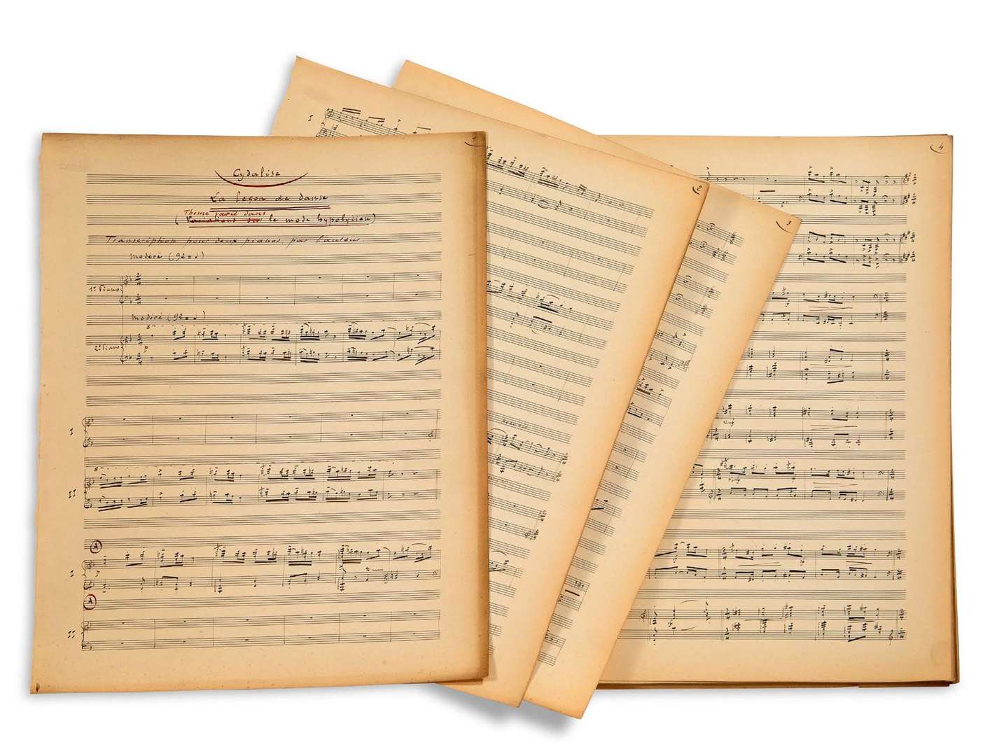 Deux Danses. - Danse de Styrax (2e tableau), marquée Allegro non troppo, datée en fin «Mai 1915» (8 pages). C'est le final du 2e tableau : «le Capitaine et le Fermier Général félicitent le Maître de Ballet. Cydalise fait signe qu'elle a froid. Le Fermier Général, pour lui chercher une mante, se précipite vers le panier, l'ouvre... Styrax en jaillit, bondit vers Cydalise et l'embrasse. Stupeur de tout le monde. Le Maître de Ballet lui demande qui il est, et Styrax, au grand émerveillement général, se met à danser une danse effrénée, à laquelle Cydalise finit par se mêler. Tout le monde est gagné par ce mouvement frénétique, danse générale au cours de laquelle Cydalise et Styrax s'enlacent - s'enlacent si étroitement que le Fermier Général et le Capitaine interviennent et entraînent Cydalise. Avant de sortir, elle jette à Styrax la rose de sa ceinture, et Styrax lui donne la flèche de l'Amour qu'il a gardée. Styrax brandit la rose comme un trophée et danse sa victoire et sa joie. Tous l'imitent». - Final du 3e tableau, marqué Allegretto, Bien mesuré et rythmé, daté en fin «Avril-Mai 1915» (8 pages). Le livret indique que Styrax, dans la chambre de Cydalise, a découvert «la corbeille à billets doux. Cydalise l'invite à lui en écrire un, en lui tendant une plume. Mais Styrax ne sait pas écrire. Elle veut lui faire lire ceux qui restent dans la corbeille. Il ne sait pas lire. Que sait-il donc faire ? Jouer de la flûte ! Il joue de la flûte de Pan, elle danse. Peu à peu il se mêle à cette danse, qui devient amoureuse, puis passionnée. Elle lui fait jurer de l'aimer toujours. Il jure, sur la rose qu'elle lui a donnée, de ne jamais la quitter. Ils vont, enlacés, vers le fond. Elle ouvre la fenêtre pour respirer l'air du matin : du fond du jardin montent les voix de la forêt qui s'éveille, Styrax s'arrête, très ému. Cydalise s'efforce de reprendre Styrax, de l'écarter de la fenêtre. Il résiste, elle insiste, elle lui bouche les yeux de ses mains. Styrax se sent repris par les voix de la nature. Et voici qu'au bord des fenêtres, dans le jour qui monte sur le ciel rose. apparaissent les visages des chèvre-pieds et des nymphes. Quelques-uns sautent dans la chambre, les petits faunes et dryades tombent des lucarnes ou dégringolent des œils-de-bœuf. Ils portent des branches de roses, des fleurs ru